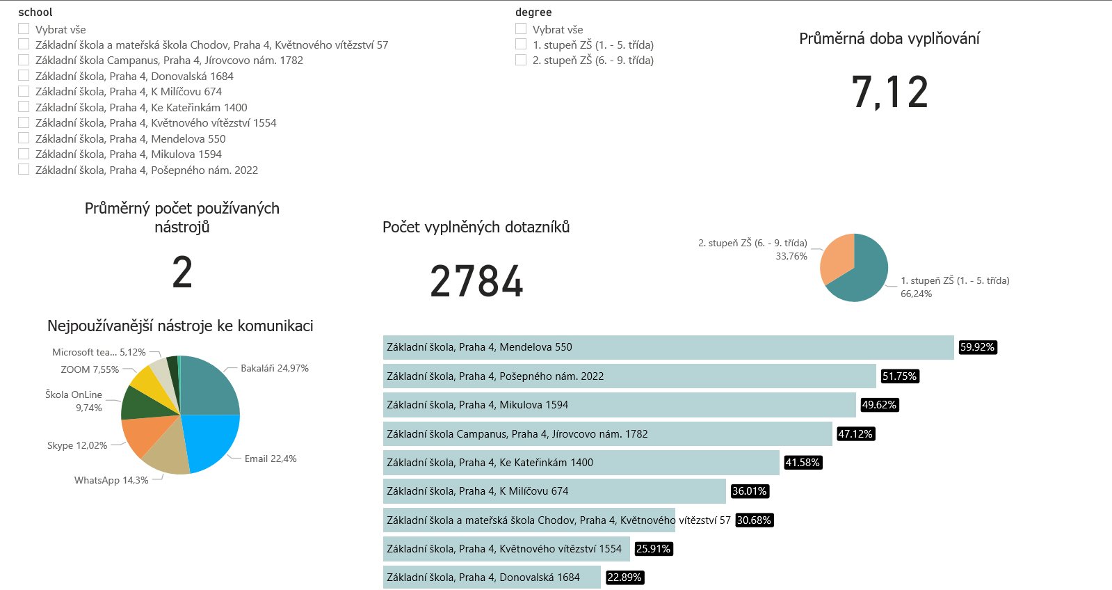Sběr dat od rodičů probíhal od 18. 5. 2020 do 24. 5. 2020, analýzu dat provedla společnost Operátor ICT. Dotazníkového šetření se zúčastnilo všech devět jihoměstských základních škol zřizovaných Prahou 11. Celkem jsme obdrželi 2784 vyplněných dotazníků. Především chci poděkovat všem rodičům, kteří si našli čas a dotazník vyplnili. Potěšilo mě, že odpověděla třetina oslovených rodičů, to je skvělý výsledek! Rodiče hodnotili různé okruhy distanční výuky ve škále 1 (souhlasím) – 4 (nesouhlasím) s další možností – nedokážu posoudit.