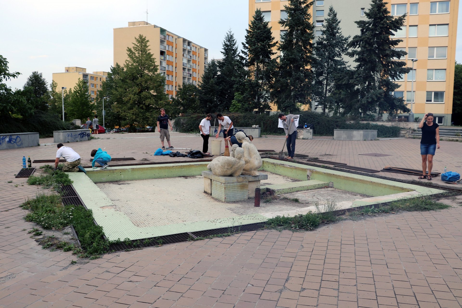 Společnými silami jsme uklidili prostor kolem nefunkční, chátrající a trávou zarostlé fontány Rodina za OD Blankyt.