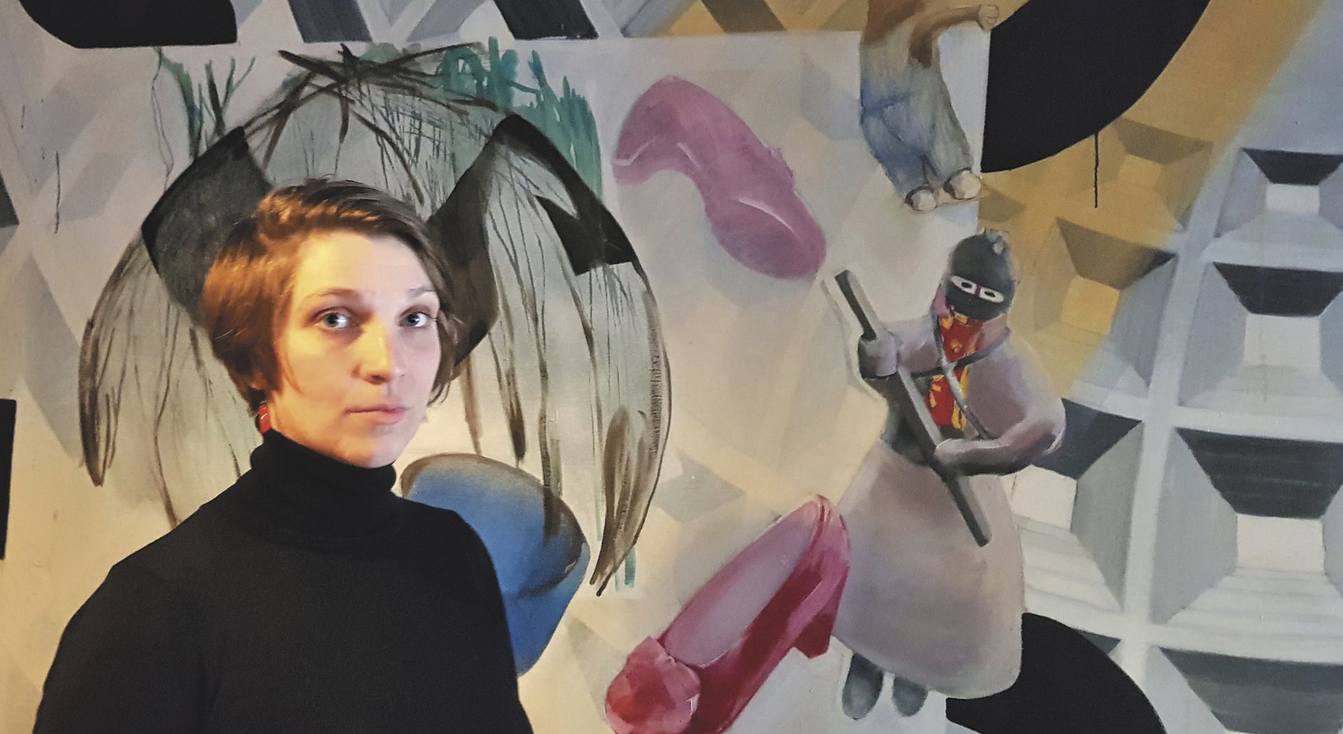 Na jednom obraze (Ničitel) je motiv kuřete bořícího paneláky. Chtěla jsem ukázat ztracenost, anonymitu, tak jak na mě místo působilo. Obrazy mapovaly moje pocity a vzpomínky z dětství. Obraz Punčocháče je autoportrétem z tohoto období. Na obraze sedím mezi prázdnými postelemi, výjev má lehce tragický podtext. Malovala jsem alegorie s motivy sídliště, ale i výseky budov, jež jsou atributem a nesou charakter Jižního města. V současné době už na Jižáku nežijete. Když ho navštívíte dnes, jak Vám připadá, jak se cítíte?